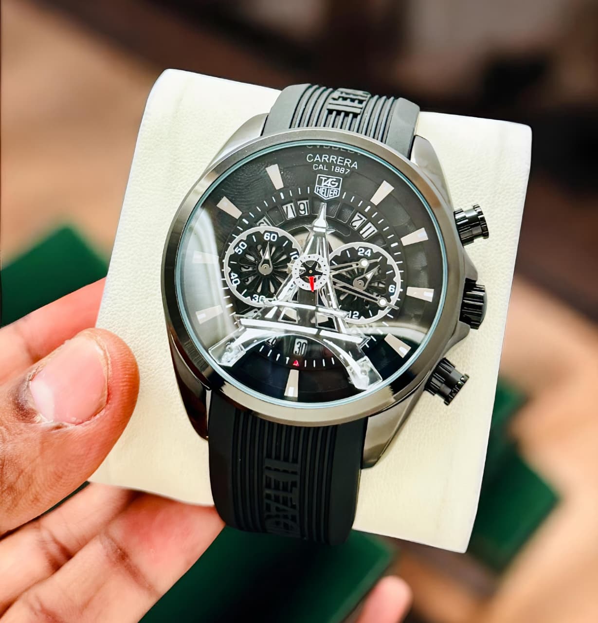 #Features -All Working Chronograph, Two Sub dials For 60 Minutes, And 24 hours, Full Date small Windows Showing inside dial,Working Date Features, Alloy Metal Case,Solid Dial Case, Glass Black, Good Quality Full Black silver gold Silicon Belt Machine, Eiffel Tower Design In Dial With Black Finishing Dial Ring, High Quality Sapphire Crystal Glass, with Heavy Quality Quartz Machinery.